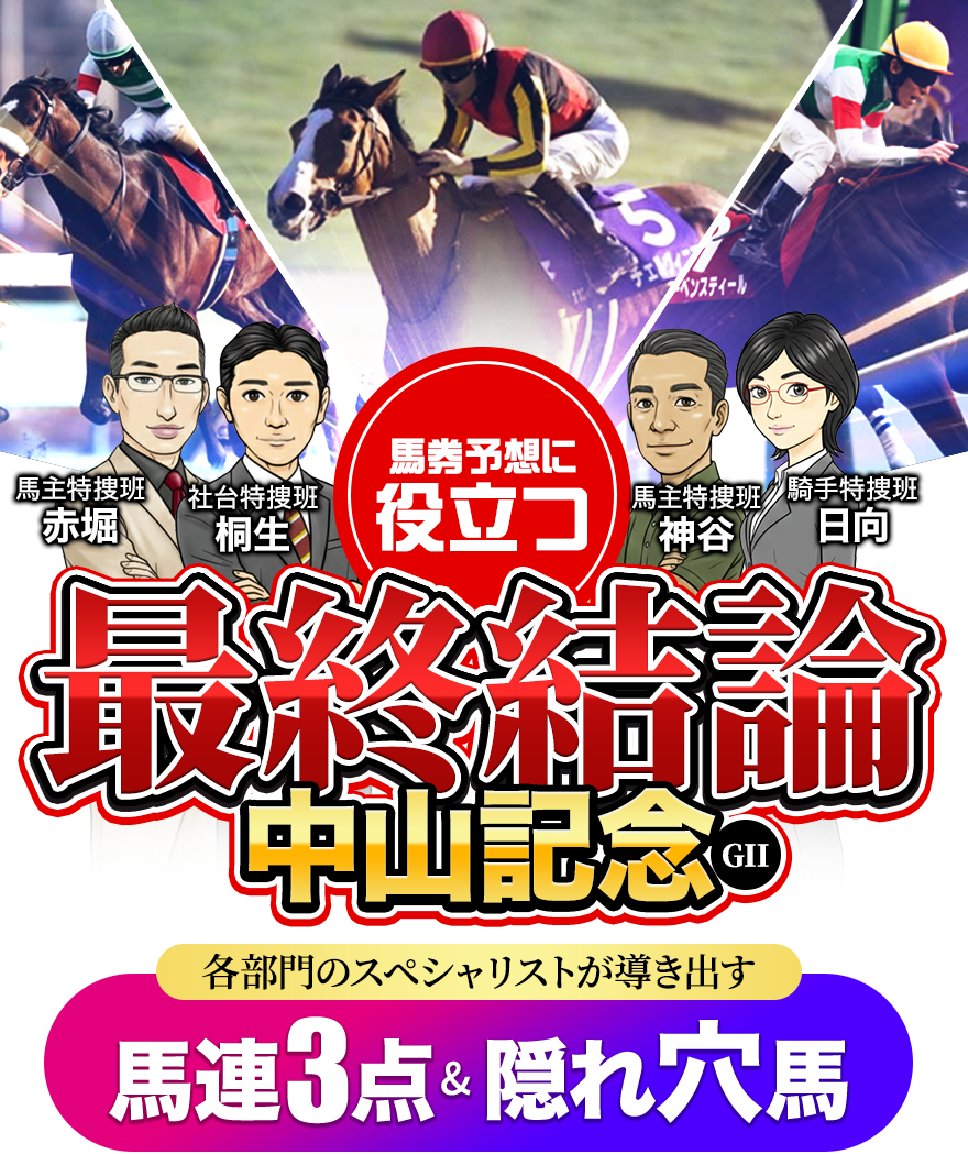 各専門分野のスペシャリストが導き出す馬連3点&隠れ穴馬は馬券購入前に必ずご確認ください!