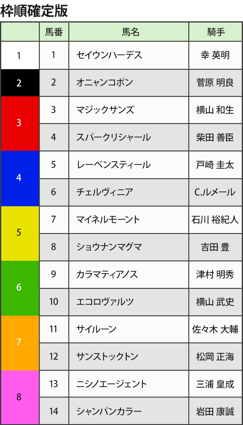 1番人気で勝ったのはヒシイグアス、ダノンキングリー、ドゥラメンテの3頭のみ。上位人気馬が揃って馬券圏を外したのは2度あり大波乱になるケースもある。平均配当は【馬連4730円】【3連複1万7330円】【3連単11万1060円】。馬連3桁配当は2度、馬連万馬券も2度。3連単10万馬券以上が3度、3連単最高配当は54万2050円。昨年は上位人気馬での決着も直近3年で2度、上位人気馬が揃って馬券圏を外しており波乱になっている。4番人気~9番人気が10連対。人気が被らない同距離好走歴・コース巧者は要注意!