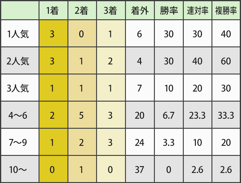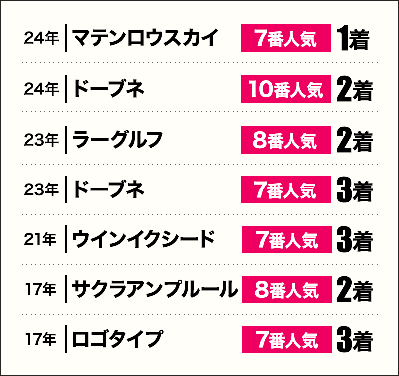 7~10番人気の伏兵馬が7頭馬券圏に好走しているように人気薄が配当を引き上げている。近走の成績が不振でもコース実績、同距離実績、この時期に好成績集中の人気薄には要注意。