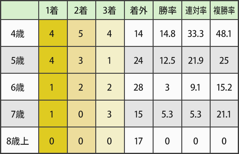 年齢別の成績では4.5歳馬が4勝。連対でも4.5歳馬が8.9連対しており他世代よりも好走している。6歳馬以上は2勝のみで苦戦。4.5歳馬中心のレース。重賞で連対実績がある5歳馬、クラシック戦出走歴がある4歳馬は要注意。