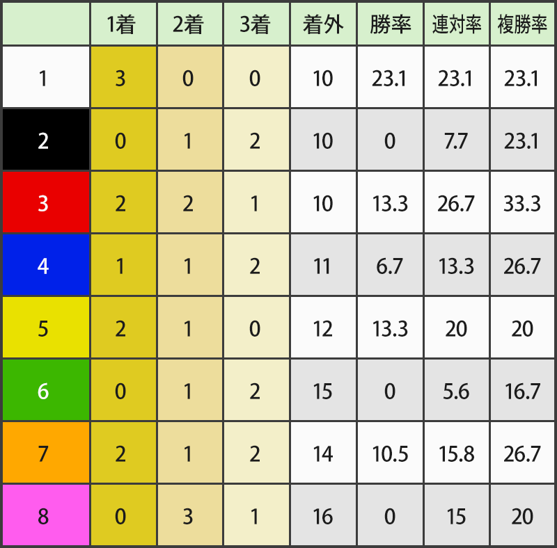 枠番別では内枠(1~3)が5勝2着3回、中枠(4~6)3勝2着3回、外枠(7.8)2勝2着4回。勝ち馬が出ていないのは2.6.8枠。1枠&3枠からの好走馬が多い。先行馬有利のコースで後方待機組は厳しい。内枠から中枠で先行脚質の馬は要注意!